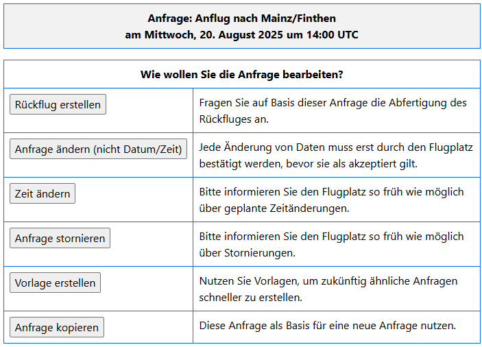 Nachdem die Anfrage versandt wurde, bestehen (abhängig vom Bearbeitungszustand durch den Flugplatz) verschiedene Möglichkeiten zur Änderung bzw. Stornierung. Klicken Sie hierzu unter "Aktionen" auf <Bearbeiten>. Sie gelangen dann in folgende Übersicht: